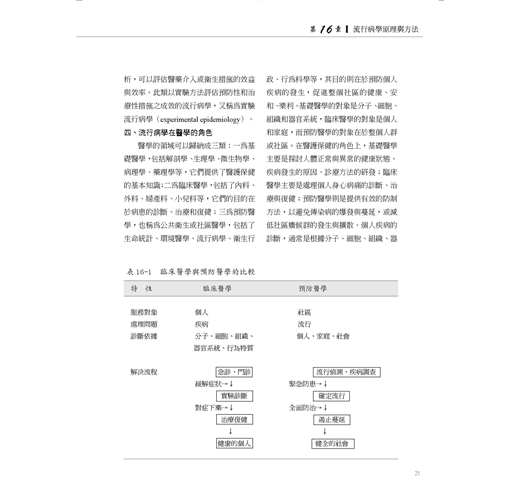 醫學的領域可以歸納成三類:一為基礎醫學,包括解剖學、生理學、微生物學、病理學、藥理學等,它們提供了醫護保健的基本知識;二為臨床醫學,包括了內科、外科、婦產科、小兒科等,它們的目的在於病患的診斷、治療和復健;三為預防醫學,也稱為公共衛生或社區醫學,包括了生命統計、環境醫學、流行病學、衛生行政、行為科學等,其目的則在於預防個人疾病的發生,促進整個社區的健康、安和、樂利。基礎醫學的對象是分子、細胞、組織和器官系統,臨床醫學的對象是個和家庭,而預防醫學的對象在於整個人群或社區。在醫護保健的角色上,基礎醫學主要是探討人體正常與異常的健康狀態、疾病發生的原因、診療方法的研發;臨床醫學主要是處理個人身心病痛的診斷、治療與復健;預防醫學則是提供有效的防制方法,以避免傳染病的爆發與蔓延,或減低社區癥候群的發生與擴散。個人疾病的診斷,通常是根據分子、細胞、組織、器官系統、行為特質來判定;而社區癥候群的診斷,則由個人是否健康、家庭是否健全、社會是否安寧來判定。臨床醫學有門診和急診之分;預防醫學也有慢性病和急性病防治之別。臨床醫學對於就診的病人,若有緊急的症狀,即便診斷未明,也應給予緩解症狀的救治,以減低對生命的威脅;然後繼續進行各種實驗診斷以確定疾病,進行對症下藥的治療。相對的,當社區剛發生流行時,必須採取緊急防疫措施,如流行監測與檢疫隔離,以防範流行的擴大,降低對社會經濟的衝擊;再進一步深入調查流行發生的原因與機制,有效遏止流行的蔓延,回復社區的健全。臨床醫學與預防醫學的對照比較如表16-1 所示(陳建仁,1999)。