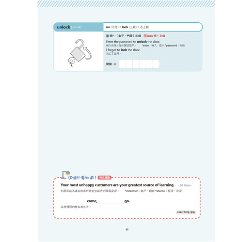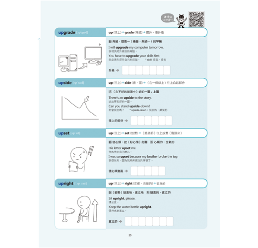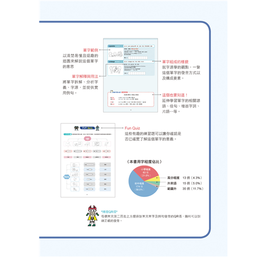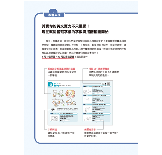 支援 QR 碼行動學習功能,隨時練習單字與句子的發音超方便◆ 選字實用,解析清楚,連初學者也能輕易理解的字首、字根、字尾單字書單字量是否夠多,是英文程度高低的一個基本指標,無論是在聽說讀寫各方面。當然,也許你也知道可以利用字首、字根、字尾的概念,去拆解一個單字的架構並理解單字的意思,同時並達到最精準、最有效擴充單字量的目的,就像小時候學國字的部首一樣,看到一個沒學過的字,光是看組成就可以「猜」出其中的意思。不過,因為一般市面上的語源(字首、字根、字尾)學習書收錄的多半是盡量彙集所有字根(大約有 250 個),然後你會看到許多艱深、甚至實用性非常低的單字,只適合具有中高級以上閱讀能力的人,而對於初級的學習者,甚至想「重新學好英文」的社會人士,看過之後只是再度承受學習英文的挫折感。