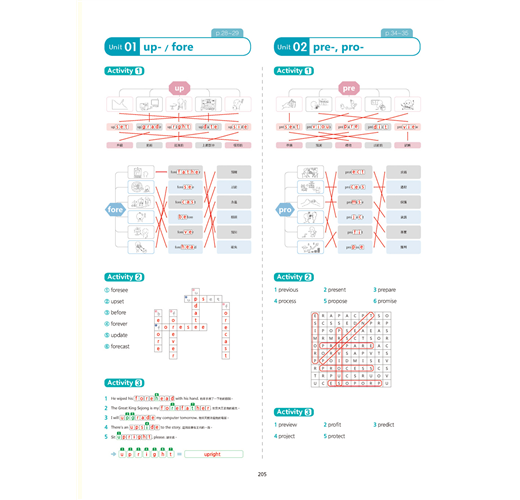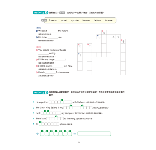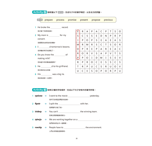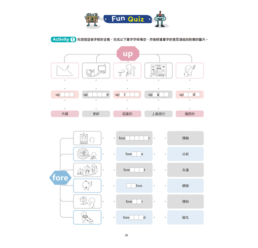 ◆「Fun Quiz + 延伸學習」,無論課堂上或在家與孩子互動都好用每個單字除了提供實用例句,幫助了解單字的用法之外,也提供學習者這一課單字的相關佳句、諺語以及增益字詞(bonus words),除了讓你進一步擴大英文字彙的視野,這些補充資訊對於各大升學或檢定考試,也都是經常出現的喔!另外,每個單元會有 3 個活動課程(Activity),包括字母及單字的填空、字母重組、連連看的遊戲,非常適合學校課堂上、私人家教或是父母在家與小孩的互動學習。