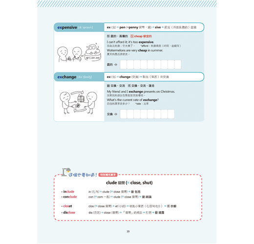 因此,本書針對最基本的50個字根,以清楚易懂且逗趣的插圖來解說這個單字的意思。另外,從字源學的觀點,讓你一瞥單字的發音方式以及單字如何構成,你不會再陷入字根組成無法語單字意思連結在一起的困境。例如 expose 這個動詞。你會先看到本書中「ex (出去) + pos (擺放) + -e → 把(東西)擺放出去」,同時你在看著旁邊的插圖,對著下方提供的單字解釋,馬上可以發出會心一笑的理解,相信你永遠不會忘記 expose 這個字的意思就是「曝露,曝光」了。