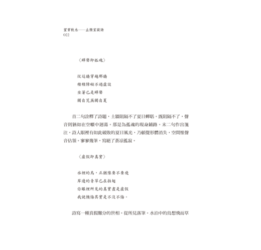 詩寫一種真假難分的世相。從所見落筆。水泊中的鳥想飛而草已因風而動,那是真實的風景嗎?因為那是倒影。其真相讓詩人疑惑著。因而有了第三句的白描。末句想及一生中懊悔的事,而此時詩人悟了,逝去如倒影,有何懊悔可言!詩點到為止。大陸詩人楊瑾主張「詩到意為止」。看來移用於僅有四行以內的截句,適合不過。