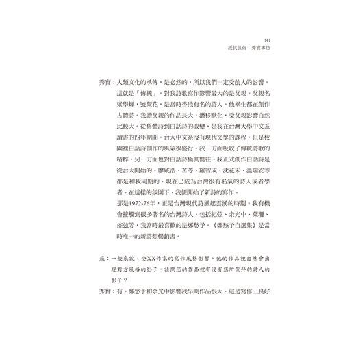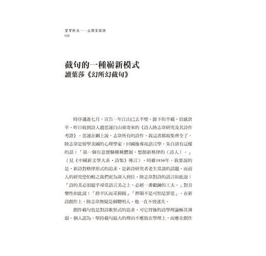 創作截句也是對詩歌形式的追求。可它背後的詩學理論極其薄弱。個人認為,堅持截句最大的理由不應放在學理上,而應在創作上。那是詩人在其創作追求上的一種喜好。把這種喜好分享出去,希望他人也愛上截句,如此而已。現時從學理上尋找對這種詩歌形式的支持,是底氣不足。如果沾上唐人絕句(截句)與律詩的關係,更為附會牽強。這較之我前面所引陸志韋的大有不如。1936年陸志韋推出《雜樣的五拍詩》,收錄了23首他對詩歌形式上的嘗試成果。五拍詩每首均六行。每行均五拍。這是一種兼有學理與實踐的嘗試。東坡在〈石鐘山記〉說:「古之人不余欺也」。信焉。