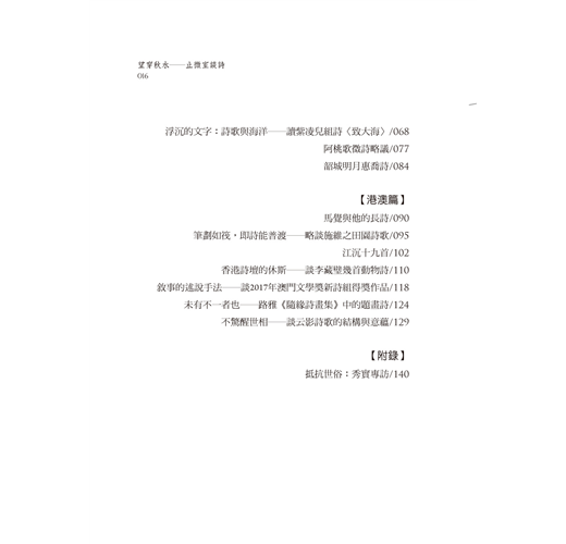 秀實的第三本「止微室談詩」。一貫保持以「語言」為評鑑準則的詩學風格,主張「詩歌意味著語言功能的改變」。本書收錄十八篇詩歌評論。內容涵蓋兩岸三地詩人的作品,包括台灣的余光中、向明、洪郁芬、葉莎,香港江沉、李藏璧、馬覺、云影、路雅、施維,大陸紫凌兒、阿桃歌、惠喬等。新詩歷史已逾百年,精采紛陳。但難以尋得一致的審美準則。因而常給讀者極大的迷思。作者在談詩之明朗與晦澀時,說:「詩歌因其呈現,沒有給予平庸讀者所渴望的線性脈絡,故而或有晦澀難明之弊,但卻在呼喚精明的讀者。」在談詩歌語言時,說:「詩歌的語言必得穿越語文而為藝術。那是判別詩與非詩的重要指標。語文是尋求詞語客觀的準確,並抵達於目標(意)。詩歌語言(藝術)即是竪立主觀的準確,並把真相呈現出來。」其精闢之處可見一斑。