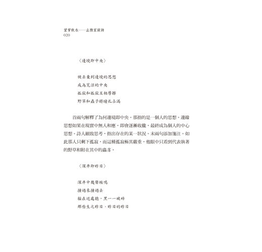 首兩句解釋了為何邊境即中央。那指的是一個人的思想。邊緣思想如果在現實中無人和應,即會逐漸收攏,最終成為個人的中心思想。詩人細致思考,指出存在的某一狀況。末兩句添加箋注。如此那人只剩下孤寂,而這種孤寂極其嚴重,他眼中只看到代表執著的野草和附在其中的蟲豸。