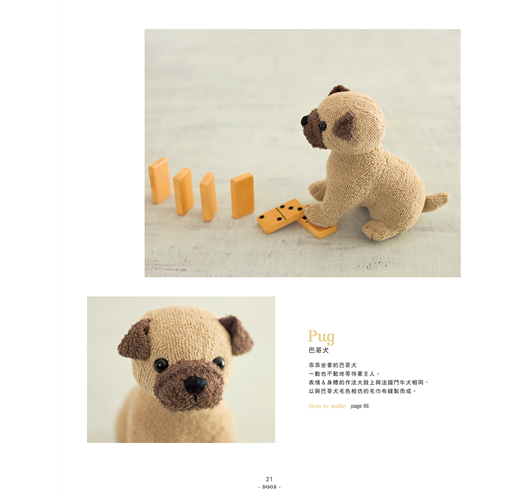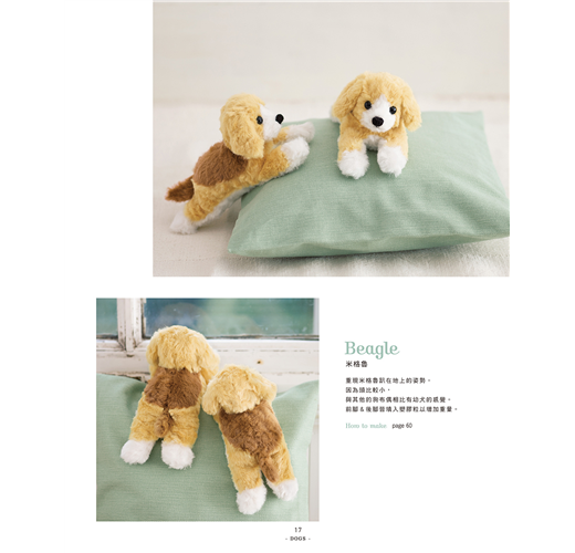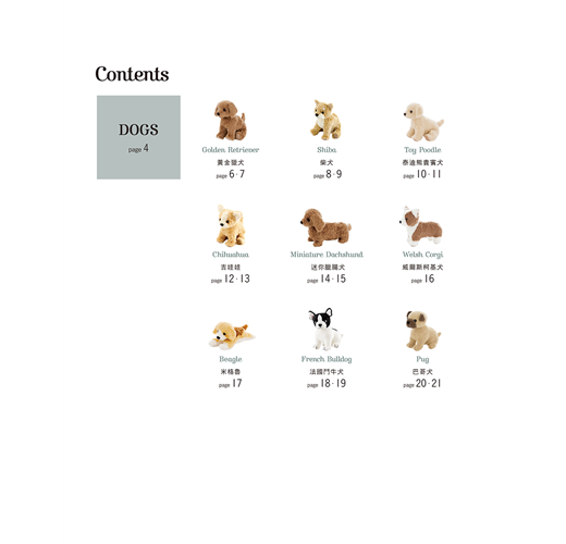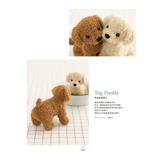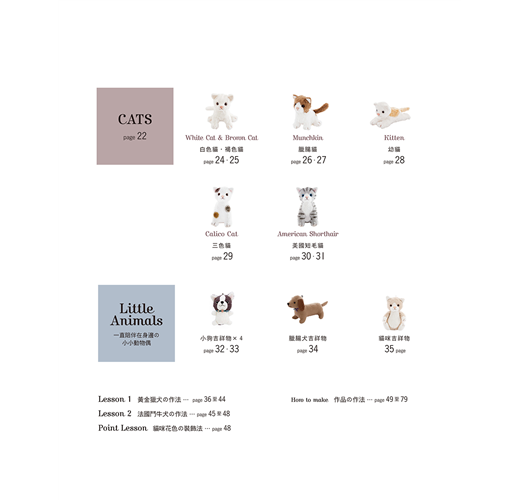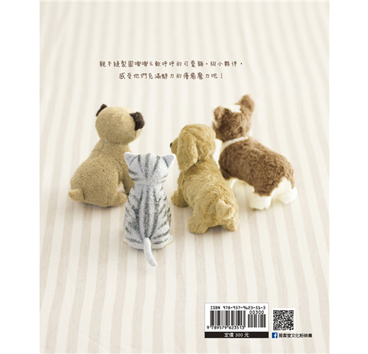 本書一共收錄11隻小狗+6隻小貓動物偶,立刻看看是否有你家毛小孩的迷你模樣,或令你心動的作品,試著作出你心目中最具魅力的手作小可愛吧!