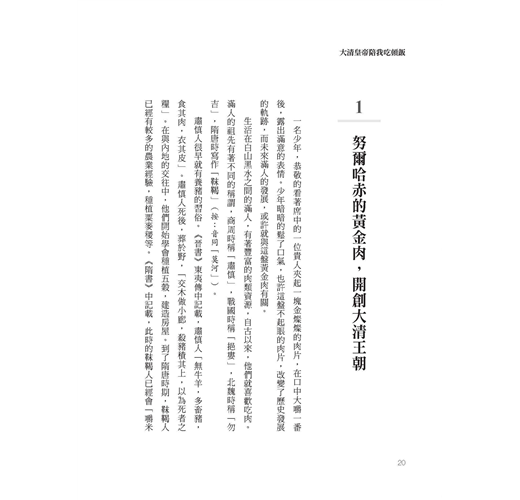 一道黃金肉,讓我們從白山黑水之間的滿人祖先,看到努爾哈赤與遼東總兵李成梁之間的恩怨情仇;從歐洲人對康熙宮廷飲食的觀察,帶出了對中國政令制度的見解;看清帝們如何以招待老年人的千叟宴推崇華夏文化,以籠絡士人、尊崇老人,又同時理出了火鍋的歷史、種類與其毀譽爭論;來自江南的宮廷美食蘇造肉怎麼成了北京的民間小吃滷煮小腸;由於乾隆帝對市井中流行的食物充滿了好奇,而被引進宮中的豆汁兒,再用一碗豆汁兒勾勒出清末重臣那桐的私生活與大歷史;從宮廷的煮餑餑,垂直的聊餃子的歷史,又水平的探究各種吃餃子的習俗。