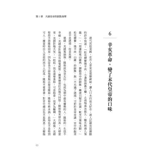 本書的第一章是線性、編年體的傳承和轉變;第二章的宮中大宴中有我們所熟知的千叟宴、蒜泥白肉的起源白片肉與滿漢全席;第三章不只是南北飲食的交流與交融,更是宮內御膳與民間飲食的相互影響和演化;第四章更進一步的討論了民間小吃如何豐富了宮廷飲膳;第五章為來自中國各地的珍饈;第六章談清代御膳房中的柴、米、油、鹽、醬、醋、茶的「故事」中,我們同時置身於結合了遠方與遙遠過去的知識殿堂。在這個情報量雖大,但真實體驗卻不斷下降的現代世界中,這樣的殿堂,讓我們更貼近了第一手的體驗。