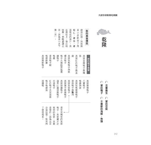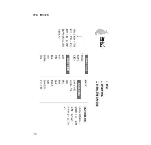 觀看本書內文的菜餚,吃得我淋漓酣暢,其中我要特別標記的是〈請皇帝吃飯曲阜孔府最有經驗〉和〈滿漢全席的名稱怎麼來?跟鰲拜有關〉兩篇。