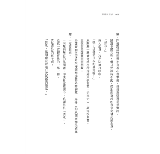 ◎如果說《蜜蜂與遠雷》嚐起來宛如一支飽滿的紅酒,那麼《節慶與預感》就像有點尖銳、卻散發出淡淡蜂蜜香氣的一支輕盈感的紅酒。