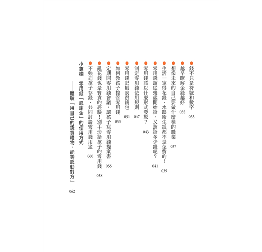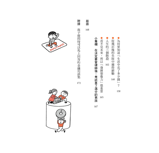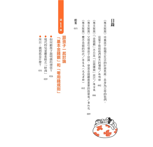 在本書中,三浦康司教導家長利用日常生活中的機會,給予孩子金錢教育。包括錢的價值、錢從哪裡來、未來的自己要做什麼樣的行業、過什麼樣的生活,從而鼓勵孩子朝自己立定的方向努力……這些的確都是孩子小的時候,就可以開始的話題。等孩子大一點,更可以藉由觀察附近的店家,或是親朋好友的職業,再配合書中的小漫畫、小故事,讓孩子了解什麼是「金錢流動」,什麼是「商業模式」,甚至了解「看不見的錢」。此外,很多家長的困擾,像是零用錢該從幾歲開始發放?該給多少?發放的形式?用途規則?以及像「做家務到底該不該給零用錢?」……等常見的問題,作者也都提出了非常專業而實用的建議。