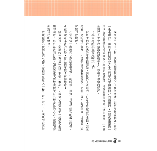 人活著沒有一天不花錢,每天都是我們教育孩子認識金錢的機會,這本書對年輕父母來說,是一本很實用的育兒理財指南。畢竟我們不再能完全因襲上一輩父母所灌輸給我們的金錢觀,我們需要跟上時代的理財知識,從日常生活裡,建構孩子對金錢的正確態度,這可是比孩子現在的考試成績更影響他未來的人生幸福啊!