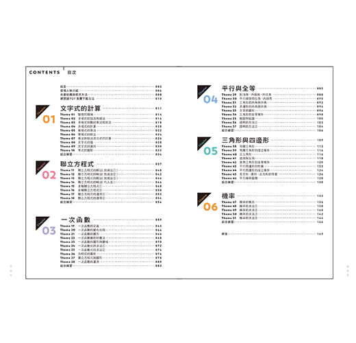 本書包含六大數學主題:「文字式的計算」、「聯立方程式」、「一次函數」、「平行與全等」、「三角形與四邊形」、「機率」。以下是孩子在學習國中數學上可能會遇到的狀況: