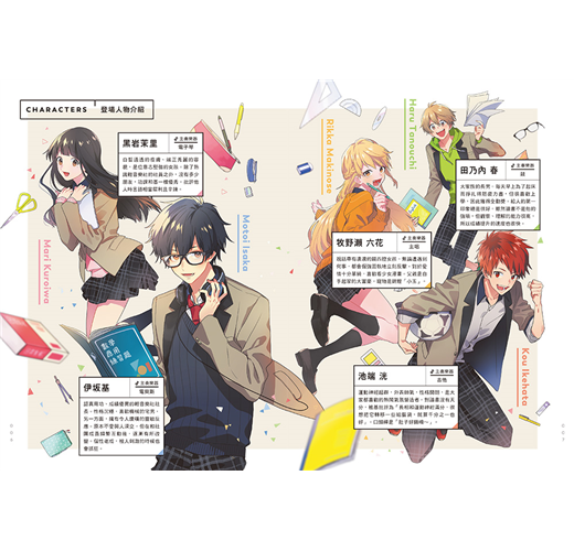 「輕音樂社」只有五名成員,他們是國中三年級的學生——基、六花、春、洸、茉里。