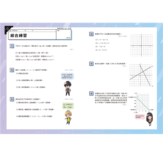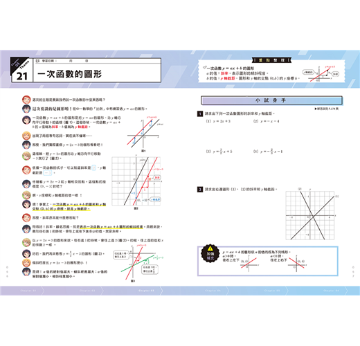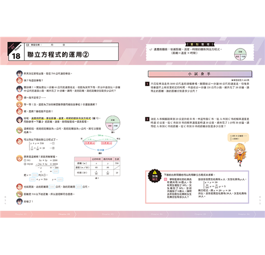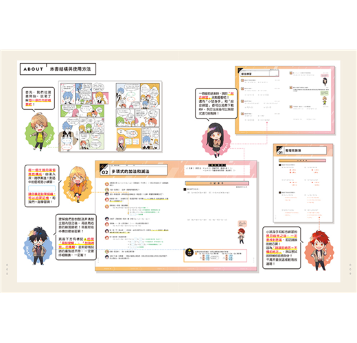 本書以漫畫做為每個主題的開門頁,讓孩子先了解大方向,並於接下來的每個單元,利用角色互動對話的方式學習數學、跟著書中成員一同解題。「公式筆記」和「加強補充」裡,有註明解題時需要注意的地方和本單元的重點公式,讓孩子加深記憶。弄清楚主題內容之後,直接挑戰「小試身手」、「綜合練習」題目,確認自己的學習吸收度。