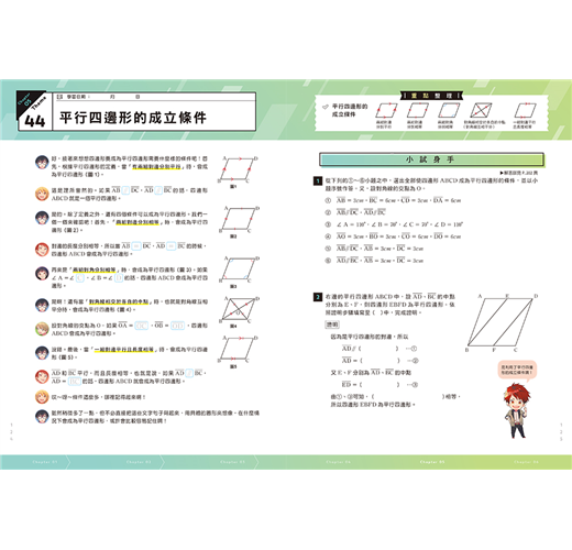 ■平行與全等──這個單元著重在分辨不同圖形的性質,有平行、對角線、角度等特性,並利用證明步驟,證明某兩個圖形是否全等。