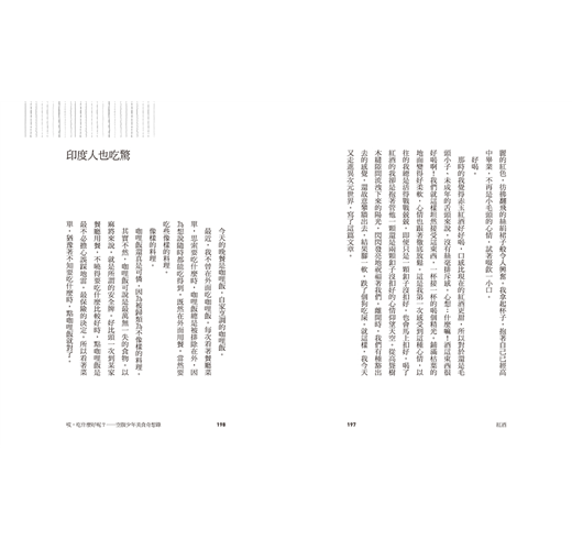 「和異性的初次親密接觸,也是像這樣幻滅與重生,不是嗎?」這一段的描寫也很精彩。吃東西這件事猶如食物與黏膜的接觸,藉由這樣的譬喻,一下子就回到美味的根源。這般穿梭自如、毫不扞格的文風,正是展現原平先生寫作功力的精彩之處。