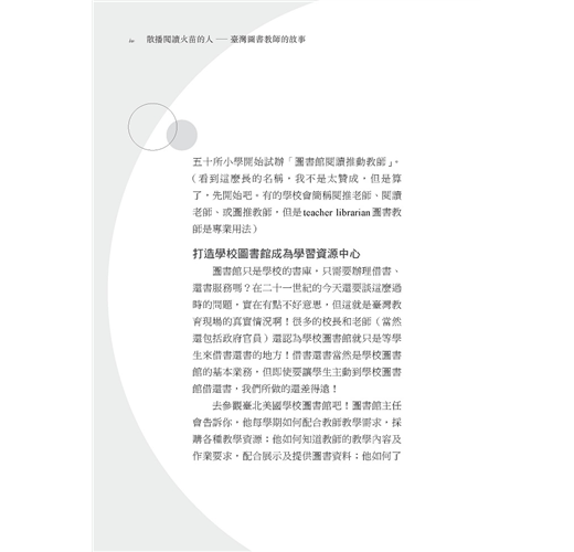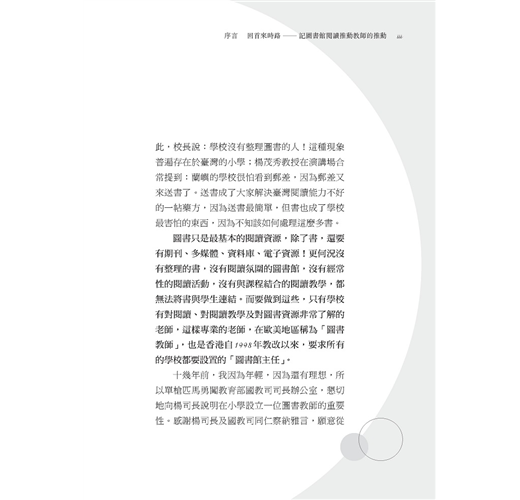 圖書只是最基本的閱讀資源,除了書,還要有期刊、多媒體、資料庫、電子資源!更何況沒有整理的書,沒有閱讀氛圍的圖書館,沒有經常性的閱讀活動,沒有與課程結合的閱讀教學,都無法將書與學生連結。而要做到這些,只有學校有對閱讀、對閱讀教學及對圖書資源非常了解的老師,這樣專業的老師,在歐美地區稱為「圖書教師」,也是香港自1998 年教改以來,要求所有的學校都要設置的「圖書館主任」。