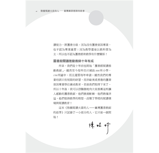 這本《散播閱讀火苗的人—臺灣圖書教師的故事》只記錄了一小部分的人,它只是一個開始!
