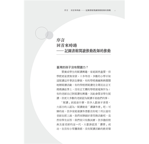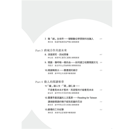 集結臺灣國中小學之圖書教師們,由他們紀錄並分享在各國中小學校圖書館推動學生圖書閱讀教育的設計、規畫和做法,共計13篇。透過閱讀活動開啟學生生命智慧,保存與散播閱讀火苗。