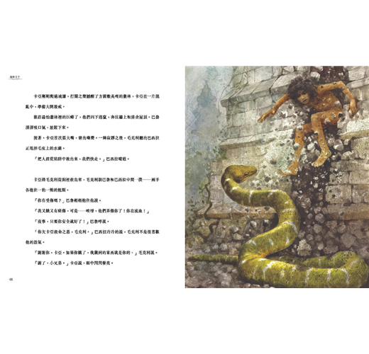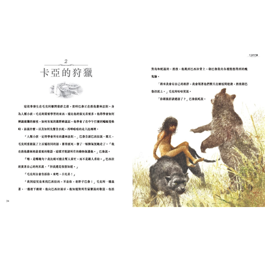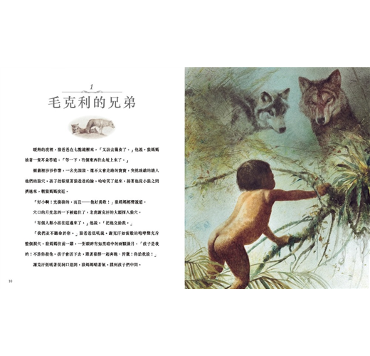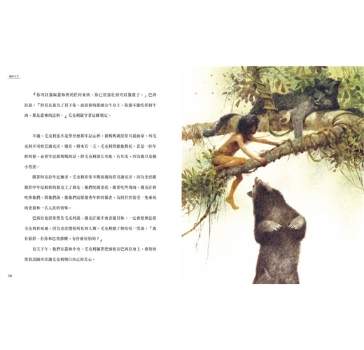 因此,這本書不只能成為孩子美學教育的入門,也會是藝術與繪本愛好者珍藏的藝術品。藉由故事主角毛克利的成長過程,大讀者可與小讀者探討「長大」、「身分認同」、「規則」、「生態平衡」……等概念,實是各階段讀者不可錯過的一本好書!