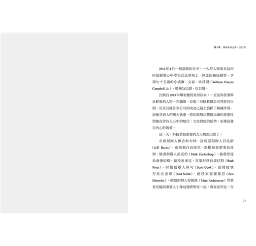 坎貝爾走在時代之前,在這個相互連結與彼此合作愈來愈緊密的世界,我們的職涯發展與公司命運都取決於人際關係的品質。坎貝爾的經驗傳承正逢其時。我相信這些經驗是歷久彌新的:他指導別人的方法在任何時代都會奏效。