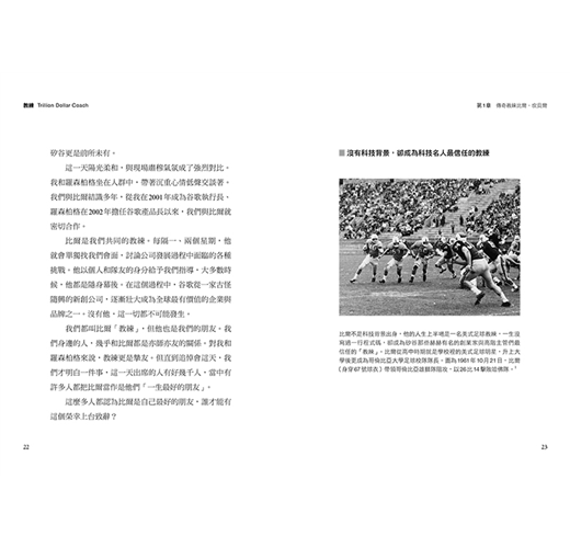 坎貝爾不是科技駭客,他的人生上半場是一名足球教練,年近四十才卸下教練職務,因緣際會踏入商界。中年換跑道時進入矽谷,最後竟神奇的成為影響世界的人物。賈伯斯把他當知己,週末時經常找他一起散步,討論自己「擔心或還沒想明白的事」。谷歌創辦人布林與佩吉也說過:沒有坎貝爾,他們不會成功。