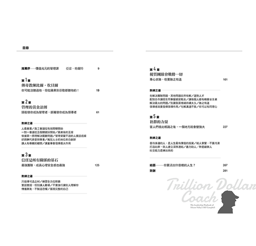 教練可能比導師重要。導師提供箴言,教練則是捲起袖子親自出手相助。教練相信我們身上的潛能,更會進入戰場,幫助我們實現潛能;教練會舉起鏡子,讓我們看見自己的盲點;教練會讓我們自己負起責任,想辦法解決遇到的難題。教練承擔了讓我們變得更好的責任,卻不會把我們取得的成就,當作是他們的功勞。坎貝爾幫助過多位矽谷巨人與重要企業創造出空前成功,我想不出有誰比他更適合被當作模範教練來傳授領導與管理的教戰手冊了。