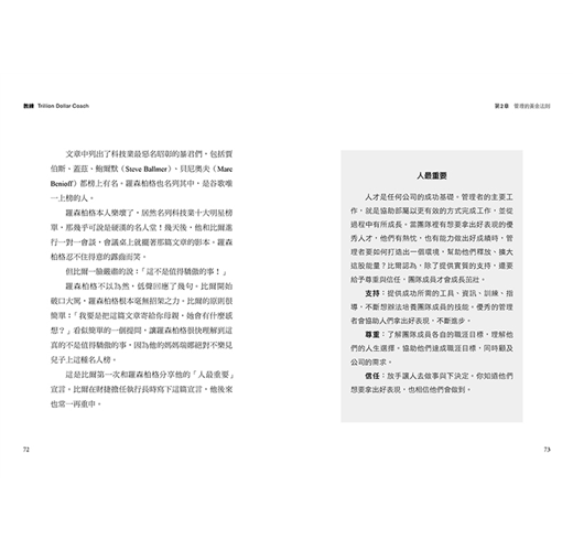 這本書的誕生讓我終於解開多年來心中的疑惑:要成為優秀的管理者,必須先得是優秀的教練。畢竟,一個人的職位愈高,你的成功就愈取決於能否讓他人取得成功。從本質上來說,這正好是教練的責任。