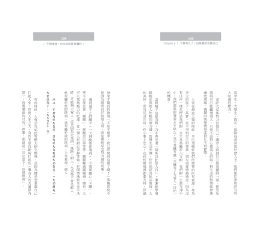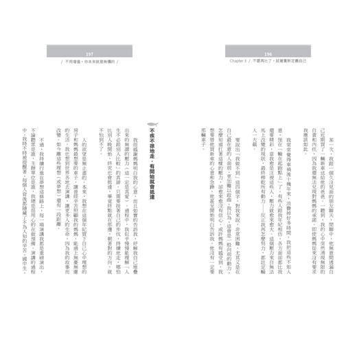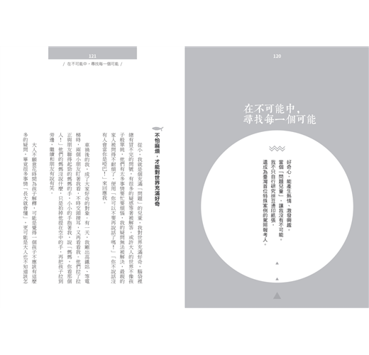 轉念,讓她抓住活著的機會,學會珍惜擁有的,不再埋怨失去的。她期待透過文字,分享「與眾不同」的生命體驗,鼓勵那些還躲在角落的人。