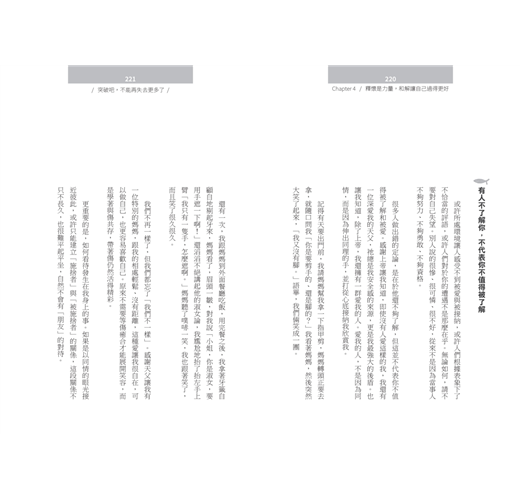 人在經歷失敗、歷經心痛的感覺後,還會願意再冒險一次、再談一場戀愛、再一次創業、再一次饒恕他人、再一次與自己和好,這些選擇都需要「先接受」,就會找到新的答案。這是看著女兒生命而獲得的智慧之道。選擇饒恕,或許無法忘記所有的傷害,不過能阻止過去繼續傷害現在的自己。如此一來,才能創造不一樣的未來。