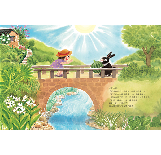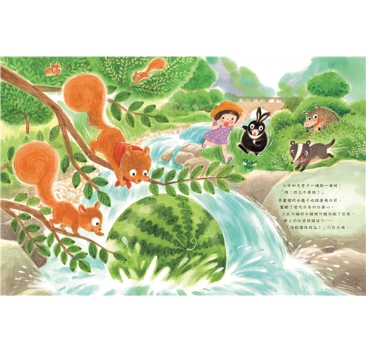 夏天天亮得早,鄉村裡蟬鳴、鳥叫、雞啼……充滿著豐富的聲音,夏天是熱鬧的季節(很熱、很吵鬧)。炎熱的夏天,最消暑的就是玩水和吃西瓜,不管大人、小孩都喜歡。把這兩項玩的、吃的結合起來,就是夏天最開心的事了!玩水的場景當然是石頭屋旁的小溪,如果只是玩水、吃西瓜好像少了點什麼,於是製造了一些效果,讓小花和史普力的朋友們都來一起追西瓜。