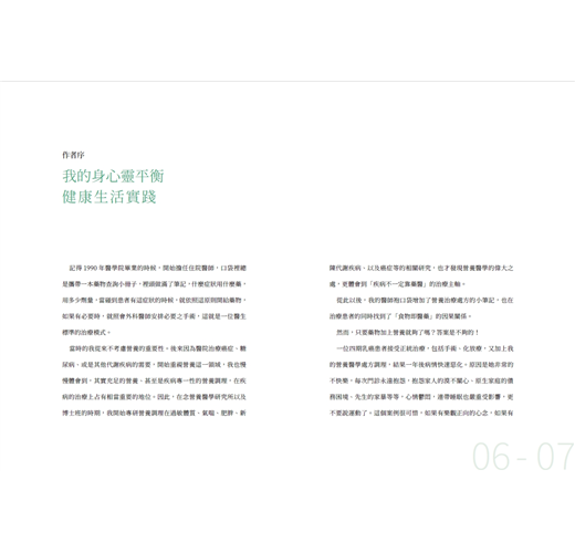 因為門診時間有限,無法在短時間內仔細說明闡述,所以透過這本書的書寫,我希望能將我親身實踐的生活型態、以及飲食調理的方法分享給大家。書中概分了六大類項:飲食大方向,如何打造家庭和樂氣氛,如何在充斥毒物的環境中輕鬆做到排毒生活,如何找到喜愛的運動並持之以恆,如何打造最優質的睡眠品質,如何放下心理層面的壓力、並走出快樂的人生。這些分享,不是希望你一定要和我一樣,而是藉此幫助大家強化全人醫學的概念,達到身心靈皆平衡的境界。
