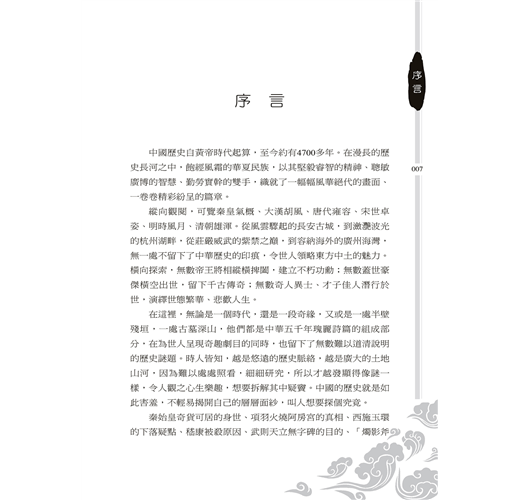 縱向觀閱,可覽秦皇氣概、大漢胡風、唐代雍容、宋世卓姿、明時風月、清朝雄渾。從風雲驟起的長安古城,到瀲波光的杭州湖畔,從莊嚴威武的紫禁之巔,到容納海外的廣州海灣,無一處不留下了中華歷史的印痕,令世人領略東方中土的魅力。橫向探索,無數帝王將相縱橫捭闔,建立不朽功勳;無數蓋世豪傑橫空出世,留下千古傳奇;無數奇人異士、才子佳人潛行於世,演繹世態繁華、悲歡人生。