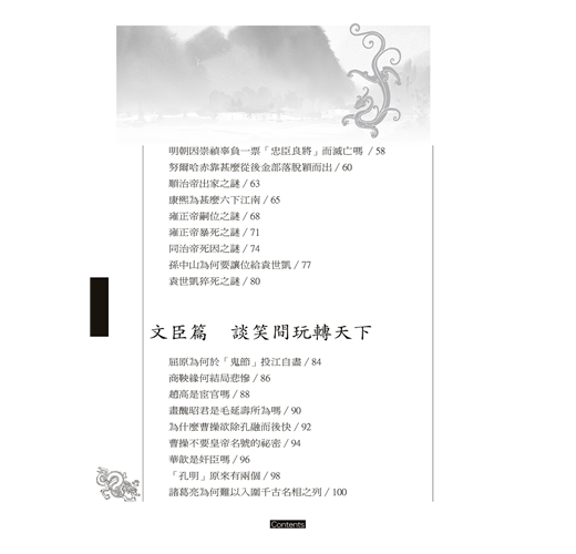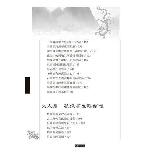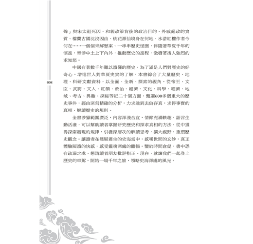 秦始皇奇貨可居的身世、項羽火燒阿房宮的真相、西施玉環的下落疑點、嵇康被殺原因、武則天立無字碑的目的、「燭影斧聲」與宋太祖死因、和親政策背後的政治目的、外戚亂政的實質、樓蘭古國沈沒因由、桃花源仙境身在何地、水滸紅樓作者今何在……一個個未解懸案、一串串歷史怪圈,伴隨著華夏千年的演進,牽涉中土上下內外,推動歷史的進程,激發著後人強烈的求知慾。