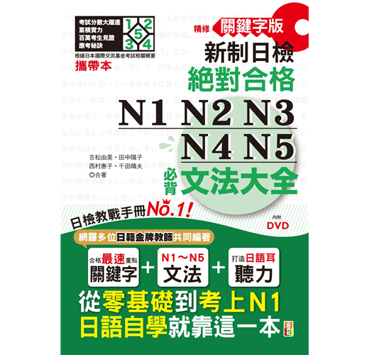《精修版 新制日檢 絕對合格 N1,N2,N3,N4,N5必背文法大全》精心出版「關鍵字」版了。