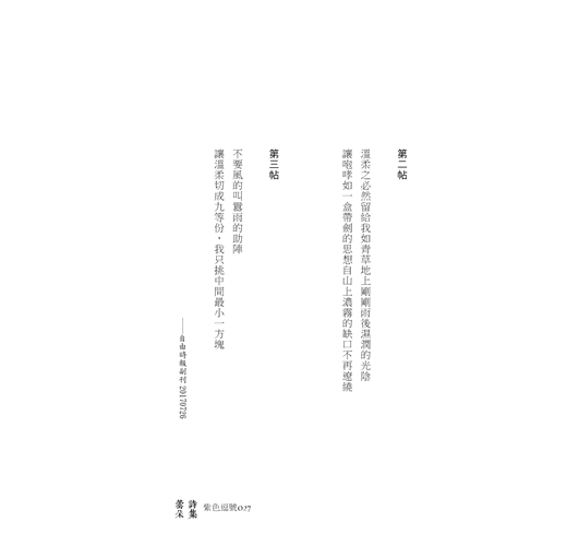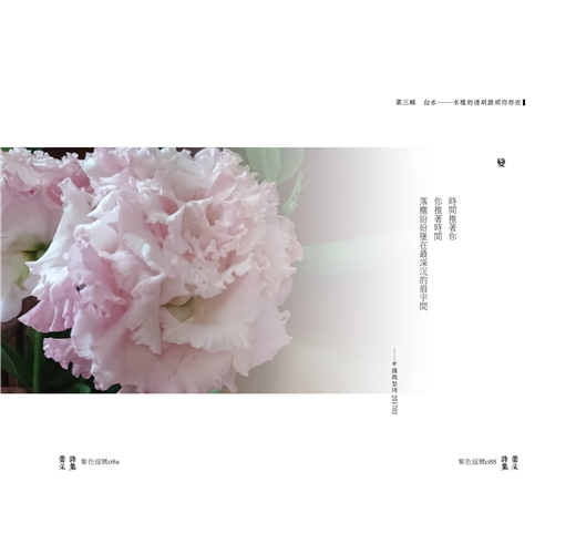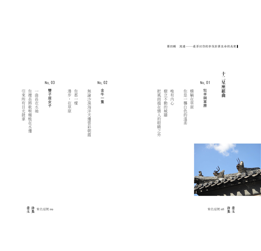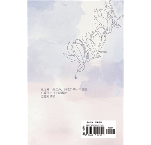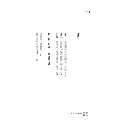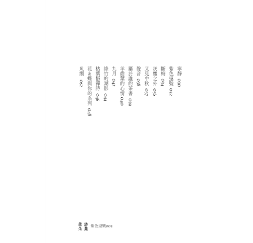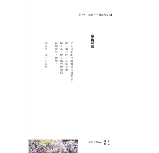 《紫色逗號》收錄中、短型詩作52首,搭配作者精選攝影作品,共分四輯:第一輯「短音──聽誰的心跳」,第二輯「灩光──虛構的光陰」,第三輯「白水──水樣的透明證明你存在」,第四輯「流連──是否以你的步伐計算生命的長度」。
