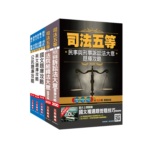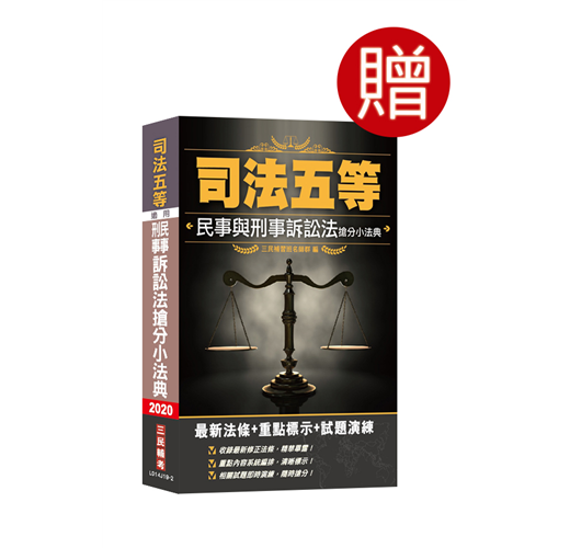 ★2020年司法特考[五等][庭務員]題庫套書,內含:國文題庫+英文題庫+公民題庫+法院組織法大意題庫+民事與刑事訴訟法大意題庫+民事與刑事訴訟法搶分小法典。★2020年全新版,題庫總題數高達5005題,題目全詳解,100%題題解析!★贈民事與刑事訴訟法搶分小法典,收錄99~108年歷屆試題,小法典的幸福公式:口袋大小+精選法條+重點標示+內嵌試題=攜帶方便+隨時閱讀+輕鬆背誦+時時搶分!【常見問答】Q:這套書包含哪幾本書?A:包含題庫攻略5書+搶分小法典1書,共6書:總共「國文題庫+英文題庫+公民題庫+法院組織法大意題庫+民事與刑事訴訟法大意題庫+民事與刑事訴訟法搶分小法典」6書。Q:套書內試題含量如何?A:總題數高達5005題:《國文題庫攻略》試題共1265題,100%題題詳解。《英文題庫攻略》試題共715題,100%題題詳解。《公民題庫攻略》試題共1070題,100%題題詳解。《法院組織法大意題庫攻略》試題共1055題,100%題題詳解。《民事與刑事訴訟法大意題庫》試題共900題,100%題題詳解。【本書適用】這套《2020年司法特考[五等][庭務員]題庫套書》適用於報考特種考試司法人員考試(司法特考)五等庭務員類科之考生。【考試利多】司法特考主要因司法院、法務部之人力需要舉辦。司法特考五等考試不必具有法律背景,且法律相關系所競爭者極少。考題全為選擇題型,因此不必擔心寫不出申論題或是法條,是非法律相關科系考生進入公職的最佳跳板!庭務員的薪資約為32,000元,因為專業加給較多,故略優於一般五等的公務人員。【庭務員工作簡介】擔任民、刑事訴訟案件開庭庭務相關工作、取送開庭卷宗、調取或歸還贓物、接受法官、書記官指揮,辦理司法行政事務及其他長官交辦之事項。【套書有什麼】◎《國文題庫攻略》2019/09◎《英文題庫攻略》2019/08◎《公民題庫攻略》2019/07◎《法院組織法大意題庫攻略》2020/05◎《民事與刑事訴訟法題庫攻略》2020/05◎贈:《民事與刑事訴訟法搶分小法典》2019/09※套書出版日期為上架日,實際出版日以各單書為準※【套書內容】《國文題庫攻略》1265題精華題。《英文題庫攻略》715題精華題。《公民題庫攻略》1070題精華題。《法院組織法大意題庫攻略》1055題精華題。《民事與刑事訴訟法大意題庫》900題精華題。總題數高達5005題。一、國文題庫攻略(一)三階段題庫,找出必救之處第一階段【主題式分類題庫】:依初等考試國文考科重點內容分為「字形測驗」、「字音測驗」、「字義測驗」、「成語測驗」、「古文及詩詞曲」、「國學常識」、「常用題辭」、「新文藝」、「書信格式用語」、「公文格式用語」十大主題,每題皆有詳細解析,有助讀者統整考題性質與出題脈絡。第二階段【模擬試題】:附有五回試題,增加考生熟悉題型與出題方向的機會。第三階段【歷屆試題】:收錄105至108年公務人員初考及鐵路特考佐級考題,題題皆有詳細解析,考生在研讀重點內容後,勤做試題演練,必能掌握考科的關鍵重點。(二)題題名師詳解,宛如親授先充分練習題目再核對答案與解析,就能收到充分的學習效果!本書採用「名師式詳解」,每道題目都撰寫詳細透徹的解析,有如名師在旁指導解惑,任何難題輕鬆舉一反三。二、英文題庫攻略(一)三階段地毯式複習,步入考場無懸念本書第一階段【主題式分類題庫】:依初等考試英文考科重點內容分為「字彙」、「文法」、「克漏字測驗」、「閱讀測驗」四大篇,每題皆有詳細解析,增加考生重點與考題的整合能力。第二階段【模擬試題】:附有十回試題,考生可熟悉題型與出題方向。第三階段【歷屆試題】:收錄101至108年公務人員初考及鐵路特考佐級考題,讓考生鑑往知來,掌握英文考情趨勢! (二)充分練習再核對答案,就能收到學習效果本書採用「名師式詳解」,每道題目都撰寫詳細透徹的解析,題目與解析獨自編排,省去邊寫題目邊遮答案的困擾。題庫就是你的彈藥庫,妥善利用「題庫書」工具,金榜題名一點都不難!三、公民題庫攻略依命題大綱與歷年試題分析撰寫第一階段【主題式分類題庫】:依初等考試公民命題大綱與歷年常考試題分為「個人、家庭、社會與文化」、「國家、政府與政治」、「民主與法治」、「生產、分配與消費」四大篇共440題,每題皆有詳細解析,幫助考生有架構地練習。公民所涉及的法規縱使再繁雜,只要擁有本書,就可省去大量整合常考重點的時間,讓您把時間花在學習的刀口上。第二階段【模擬試題】:附有五回試題共315題,做為考生演練的木人樁,立即演練增強實力。第三階段【歷屆試題】:收錄近年公務人員初考、鐵路特考佐級、地方特考五等考題,讓考生鑑往知來,掌握公民考情趨勢!共315題,題題皆有詳細解析。勤做試題就必能掌握考科的關鍵重點。四、法院組織法大意題庫攻略主題式分類試題(350題)+模擬試題(3回150題)+歷屆試題詳解(550題),總題數達900題。(一)分類題庫,抓緊考點第一部分藉由歷年試題判斷常考重點,將法院組織法及相關法規加以整理,將其分為「法院組織、法庭其他相關規則、其他重要相關法規」三篇。藉由實際演練,建立基本架構,且該主題之題目愈多,表示被出題次數愈多,讓讀者迅速抓到命題趨勢,備考事半功倍,得分關鍵不錯失。(二)實戰演練,臨陣磨槍第二部分模擬試題共有三回,由三民名師依據近年試題分析,判斷具有命題實益之考點,仿照
