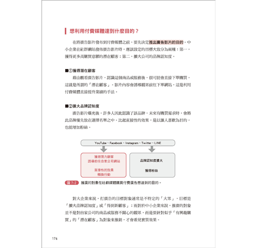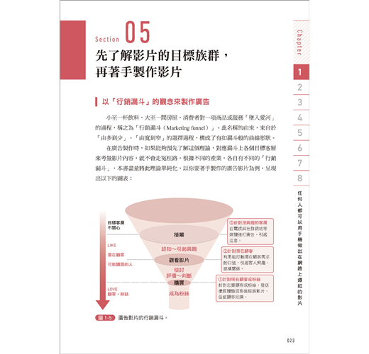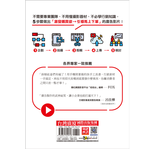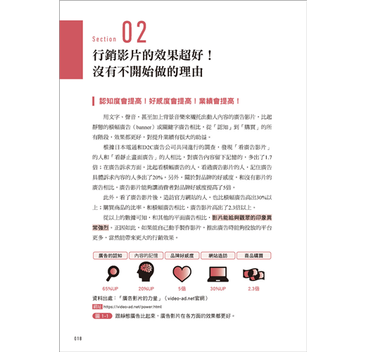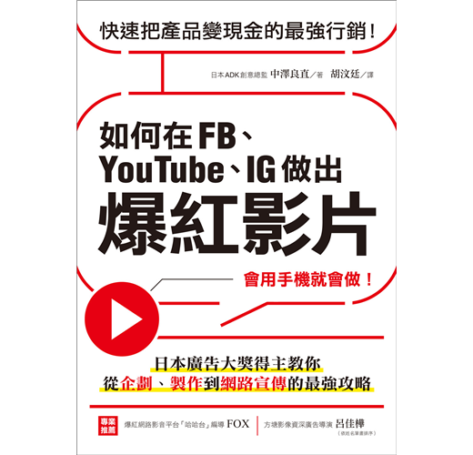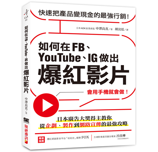 這本書會教你如何製作一支有效果的影片,從訂定企畫開始,到影片的剪輯、網路媒體的宣傳手法、運用和資料分析,甚至是針對各種網路社群特性來優化影片,都有詳細的解說。正因為我們身處在不管是誰都能簡單製作出影片的時代,更要將目標鎖定在YouTube或社群網站,讓觀眾有興趣觀看並且吸收影片內容,才能加強品牌形象與提升業績。