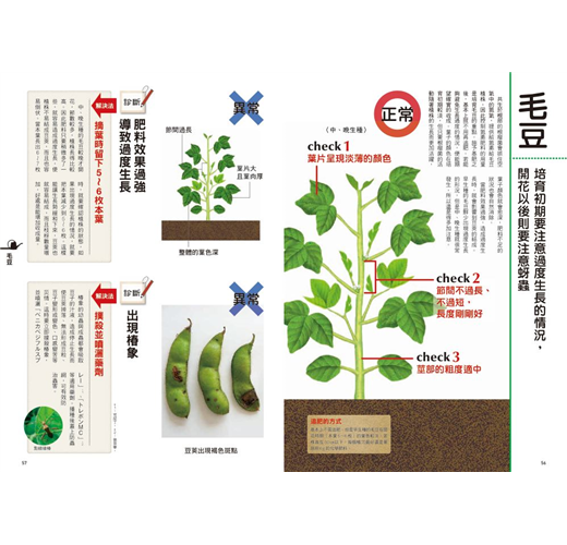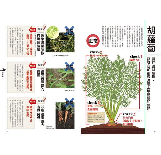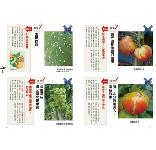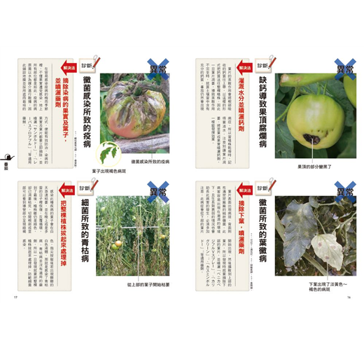 本書將針對各蔬菜作物,分別介紹「正常順利的培育狀態」及「出現異常失調徵兆的狀態」。在異常失調的頁面當中,則按照「異常失調的徵兆」→「診斷」→「解決法」的順序編排,以便各位讀者理解。