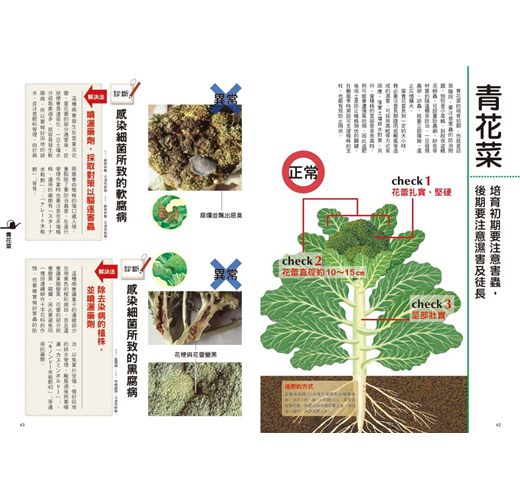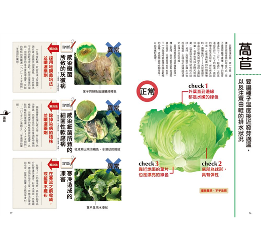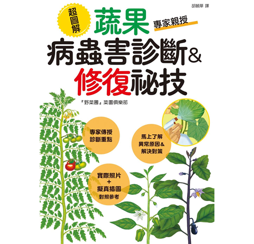 本書透過淺顯的仿真重現圖片以及實際照片,介紹蔬菜的各種失調徵兆及其修復方式。同時,也會說明作物順利生長的跡象。各位家庭農夫可以對照這些圖片和解說,試著診斷自己種植的蔬菜生長情況,搶救生病的蔬菜、提早預防疾病,培育出健康的作物!