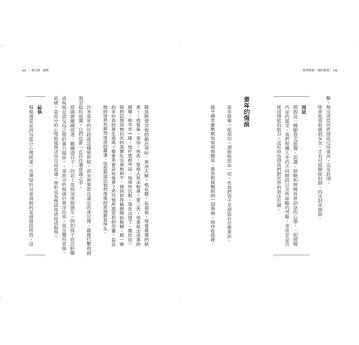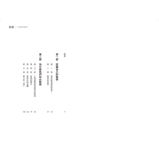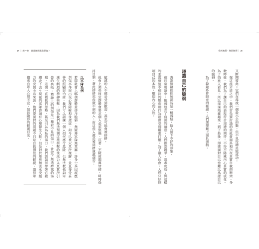 ◎脆弱不是錯誤,是每個人都會有的狀態。我們多少都能感受到自己的脆弱,卻害怕讓人知道,甚至不敢對自己承認,因為從小就被教導著要隱藏「弱點」,展示最好的一面,也怕別人覺得自己不可靠。為了保護自己,我們把不適合被別人看見的部分藏起來,想辦法表現得強壯、有競爭力、適應力強……社會普遍推崇堅強自制,貶損敏感脆弱,使得我們不得不控制自己,壓抑人性中某些層面。久而久之,活著的出發點不再是自己,生命不再鮮活,情感不再靈動。