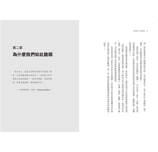 我在這本書中想表達的重點在於,脆弱其實是許多優點的集結,是不為人知的寶藏。我們可以學習去認識脆弱,正面地看待它。我也想提醒各位,並不是只有某些特定的人才會感到脆弱。我們每個人的內心都有脆弱的部分,它對於個人的自我認同與社會認同發揮了重要功能。