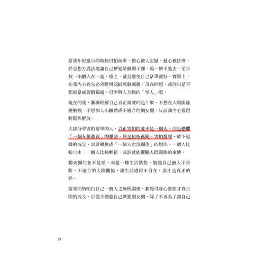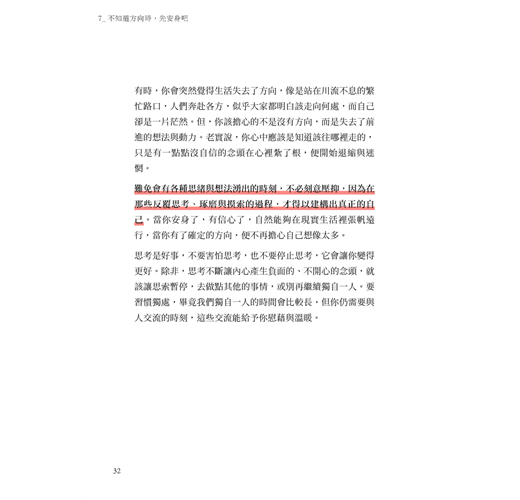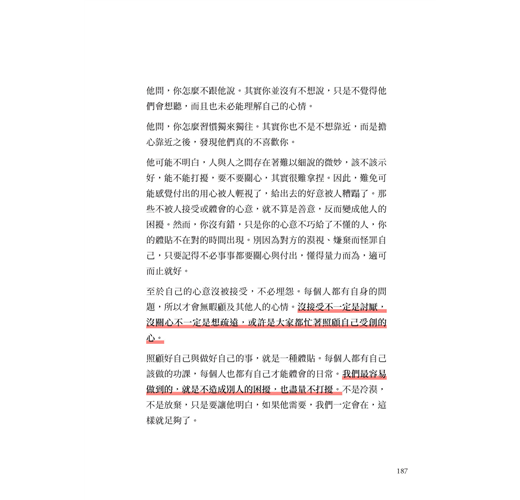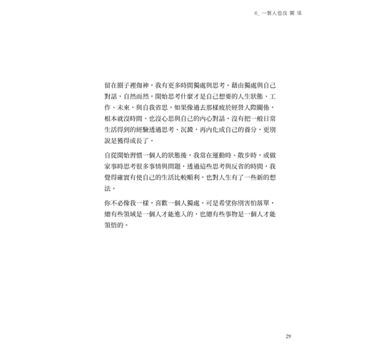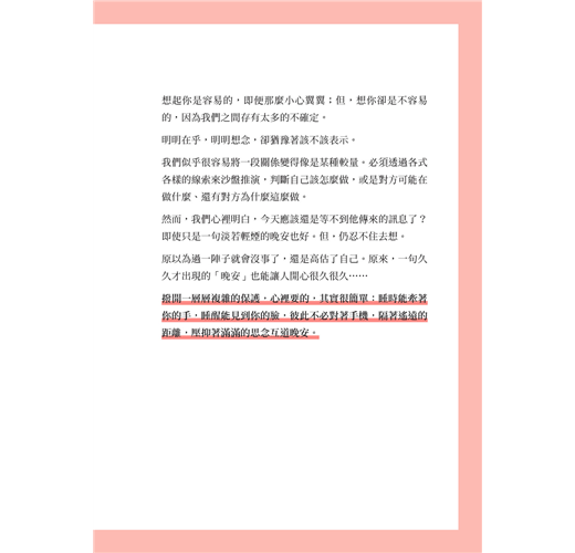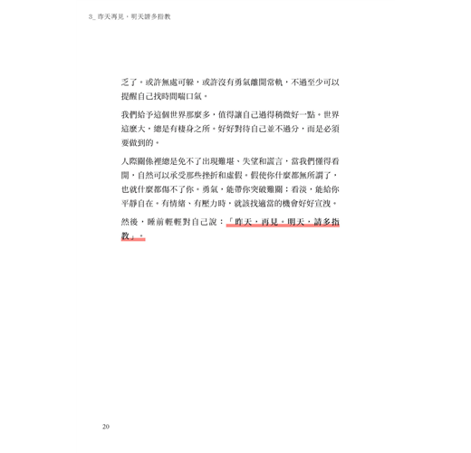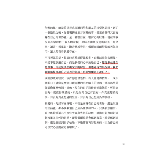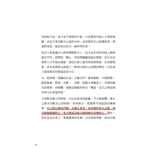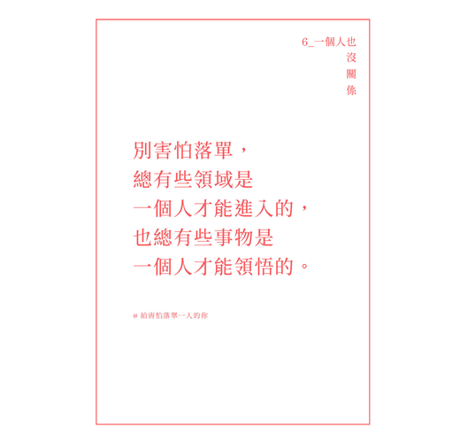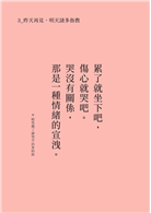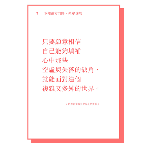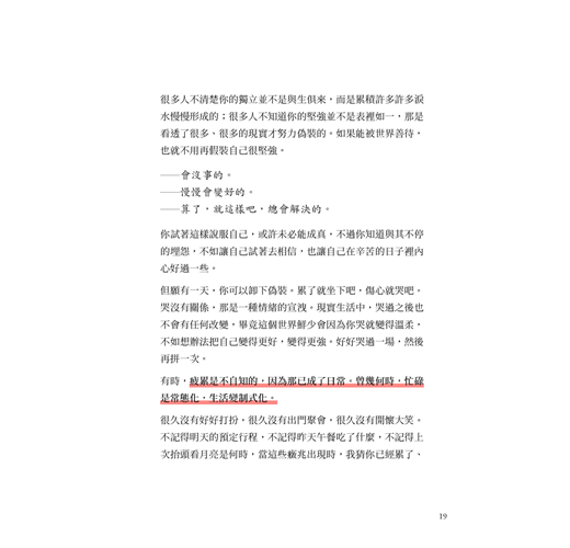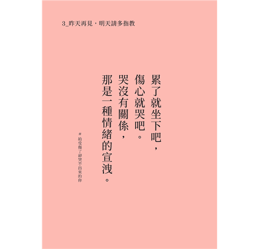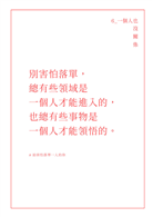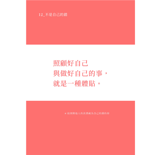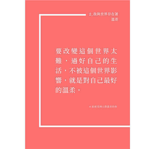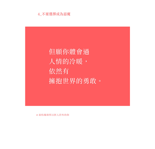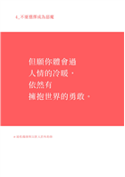 任何人事物,包含文字也都一樣,意義是自己賦與的,價值是自己評斷的。你認為有意義、有價值的,它就值得存在。在某些人眼中,這些可能是廢文,我覺得這樣的人很棒,應該他們生活順遂或是擁有優秀的才能,靠自己的能力與意志就能跨過生活中的種種困難。然而,我相信任何人都有需要被鼓勵或需要被理解的時候,在那樣的片刻,這本書的文字全是金句,是讓自己適時調整的提醒,這些我給你的一段話,都是一篇善意,一篇建議,一篇領悟,更是一篇給你的溫柔。