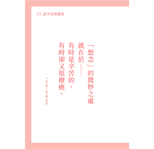 這本書不會有固定的文體與篇幅,有勵志金句、心情短文,還有生活小故事,因為想要向讀者們述說的有很多很多,所以透過不同的形式來傳達。那些文字都是我想給你與自己的一段話。