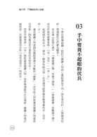 看著對方眼睛反而會被騙/居高位者,少言/積極成為別人的奴隸/不鼓勵插隊,但要學習插隊的氣魄/忙碌是無能的象徵/把話說得誇張些,你的收入才會成長/願意無償工作,是賺大錢的基礎/兩小時說教,不如兩分鐘沉默/讓對方主動問你「為什麼」/持續施小惠,輕鬆賣人情/不好意思賣人情的話,就替他「加油」/失敗和驕傲要成套販售/連坐法,是處罰也是激勵 /華僑重視效果,而非效率/從不擔心說話是否前後矛盾/準備太齊全,會降低臨場反應