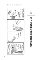 我閱讀這本書時,實在心有戚戚焉!幾乎每一種令人心煩的工作煩惱和狀況我都遇過,作者不只點出了許多在工作上一定會遇到的幾種情境劇,並提出各種調適心態的辦法,最有趣的是,還將這些小劇場畫成四格漫畫,將職場上那些令人想翻桌的各種情形,以詼諧可愛的方式呈現於書中。