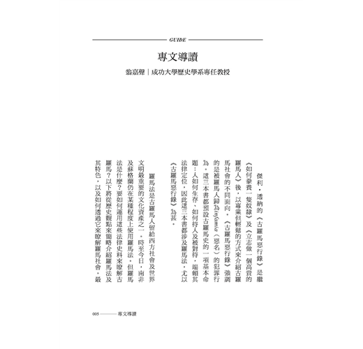 羅馬法是古羅馬人留給西方社會及世界文明最重要的文化資產之一。時至今日,南非及蘇格蘭仍在某種程度上使用羅馬法。但羅馬法是什麼?要如何運用這些法律史料來瞭解...