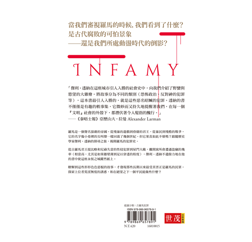 傑利‧透納的《古羅馬惡行錄》是繼《如何豢養一隻奴隸》及《立志做一個高貴的羅馬人》後,以專業但輕鬆的方式來介紹古羅馬社會的不同面向。《古羅馬惡行錄》強調的是被羅馬人歸為infamia(惡名)的犯罪行為。這三本書都預設古羅馬史的一項基本命題:人如何生存、如何待人及被對待,端賴其法律定位,因此這三本書都涉及羅馬法,尤以《古羅馬惡行錄》為甚。