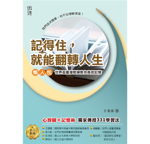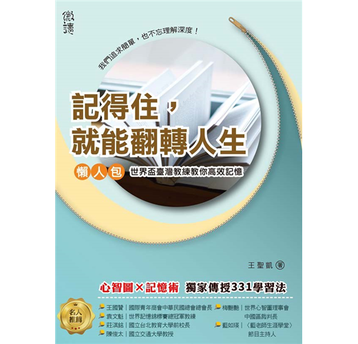 你想成為記憶高手嗎?王聖凱老師的這本《記得住,就能翻轉人生》是一本絕佳的入門書。王老師不但是中華記憶運動協會創會理事長,也是世界腦力錦標賽創辦人東尼‧博贊的直屬弟子。我個人非常佩服他在推廣記憶活動與比賽的熱情與決心,這本期待已久的書總算出版了。相較其他的記憶相關書籍,此書最大的特點就是王老師結合了「心智圖」的技巧而獨創的「三三一學習法」。相信大家在看完這本書之後,就會了解原來記憶真的不是死記硬背,而是充滿樂趣!
