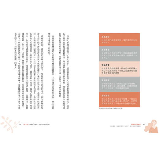 沒錯,其實,這一切從來都不容易。可以明白的是,我們無法做到百分之百,所有的事並不會如我們所願的發生。好消息是:不要緊,沒關係!真的!這就是人生,它總會不斷向我們拋出挑戰,而且都是無預警的。我們藉由挑戰成長,能不斷發掘新的自我:日子過得順遂的時候,能勇於探索新知,保存舊有的經驗;當事情不如自己所想,不符合我們所預期的模樣,也要懂得放棄。但是,假設關卡多到數也數不清,或是挑戰太巨大了,又該如何是好?如果因此影響到我們所在乎的人際關係呢?在有壓力情況下,你就會失去耐心,卻偏偏常被壓力罩頂,既然如此,改變自己就更加刻不容緩了。